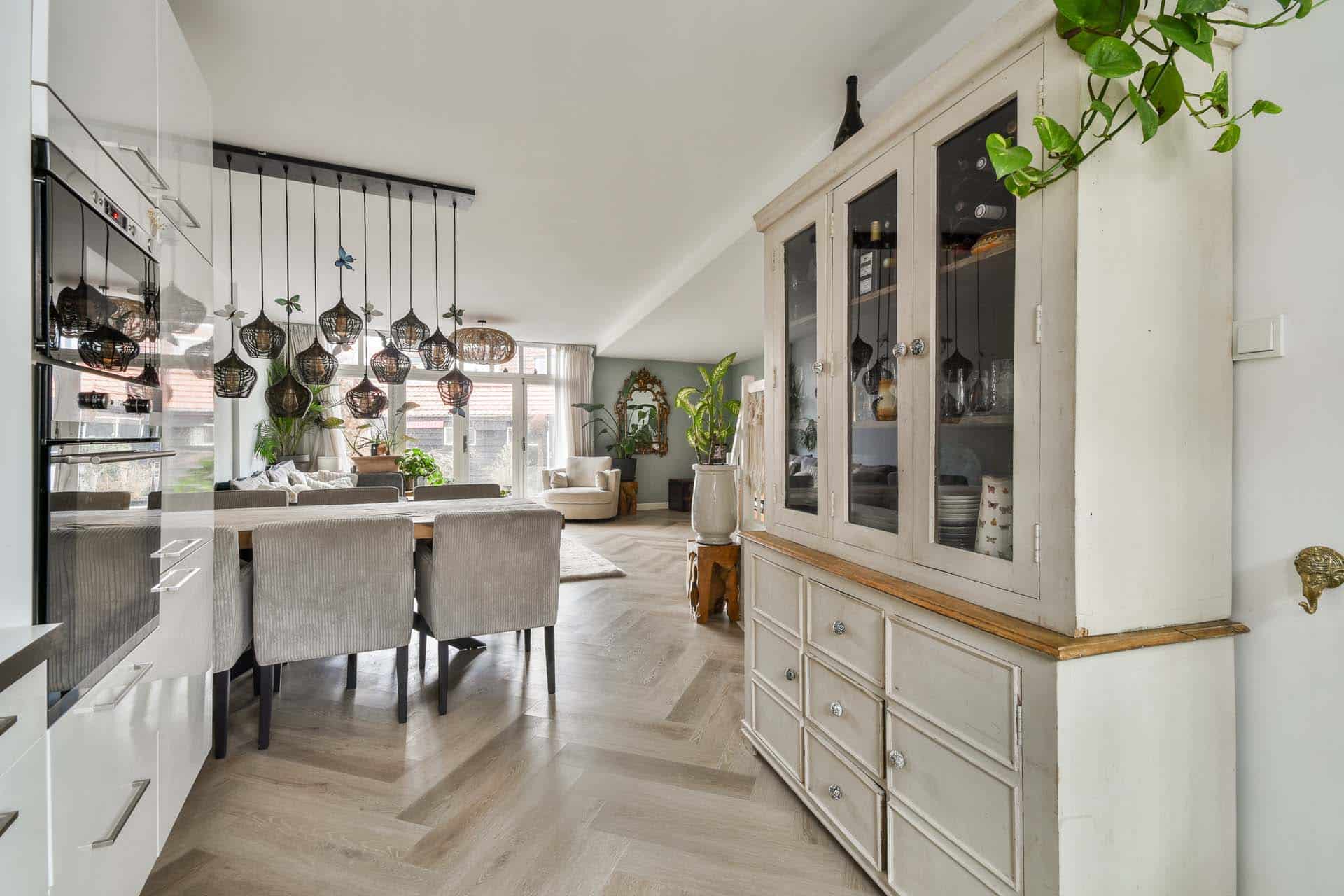 Dankzij de uitbouw van de begane grond is een royale, lichte woonkamer ontstaan die volledig is voorzien van vloerverwarming. Binnen en buiten lopen hier naadloos in elkaar over, waardoor een warme en uitnodigende leefruimte ontstaat waar u elke dag met plezier thuiskomt. De open keuken is smaakvol afgewerkt en compleet uitgerust met hoogwaardige inbouwapparatuur. Deze keuken is praktisch en groot genoeg voor iedereen die van koken houdt, terwijl de aangrenzende eethoek ideaal is voor gezellige diners en lange avonden met familie en vrienden. Via de openslaande deuren betreedt u de veranda en het terras, een natuurlijke verlenging van de woonkamer.